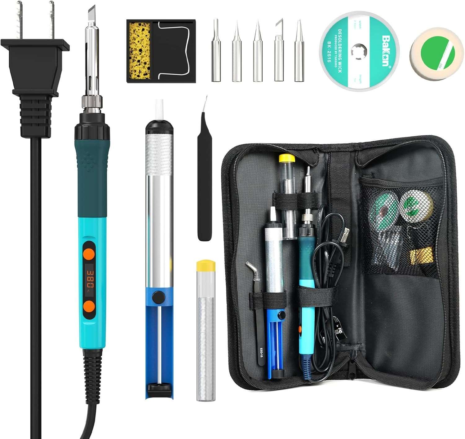 Includes essential accessories like solder wire and tip cleaning sponge.